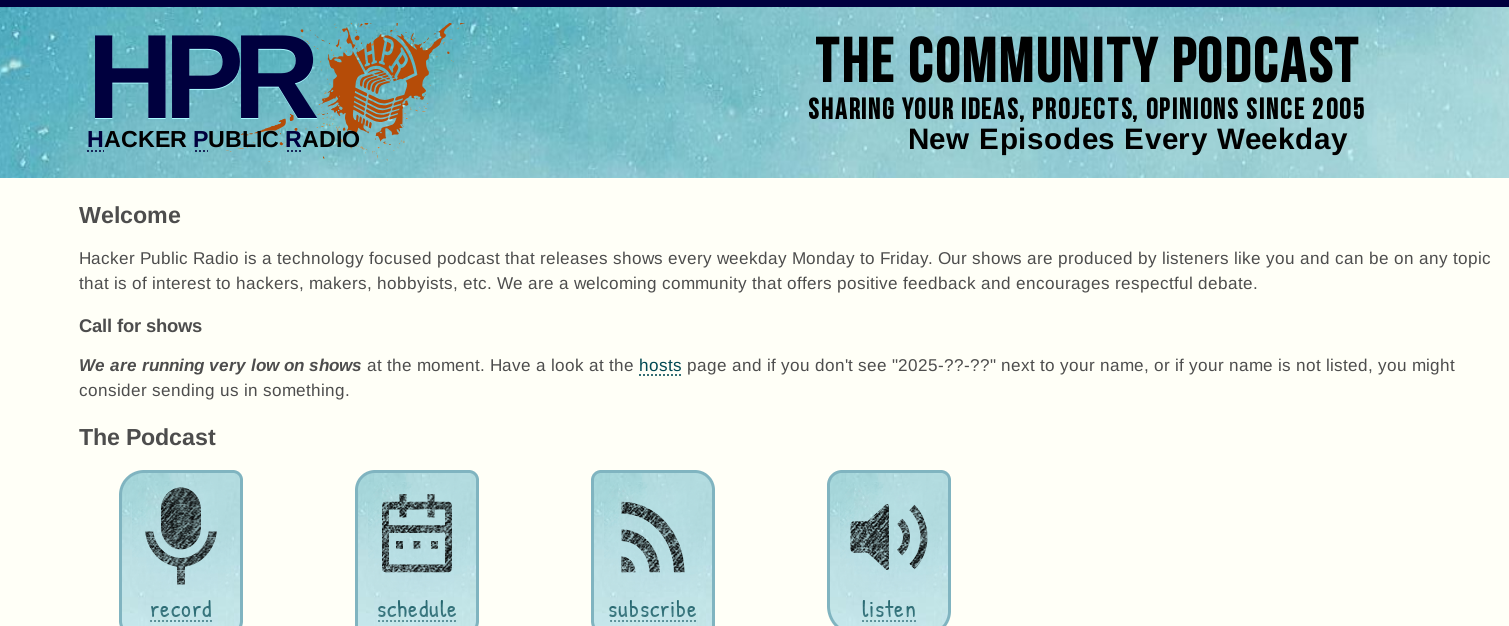 "Hacker Public Radio is a technology focused podcast that releases shows every weekday Monday to Friday. Our shows are produced by listeners like you and can be on any topic that is of interest to hackers, makers, hobbyists, etc. We are a