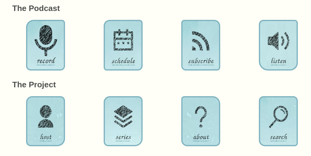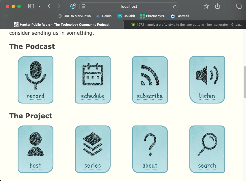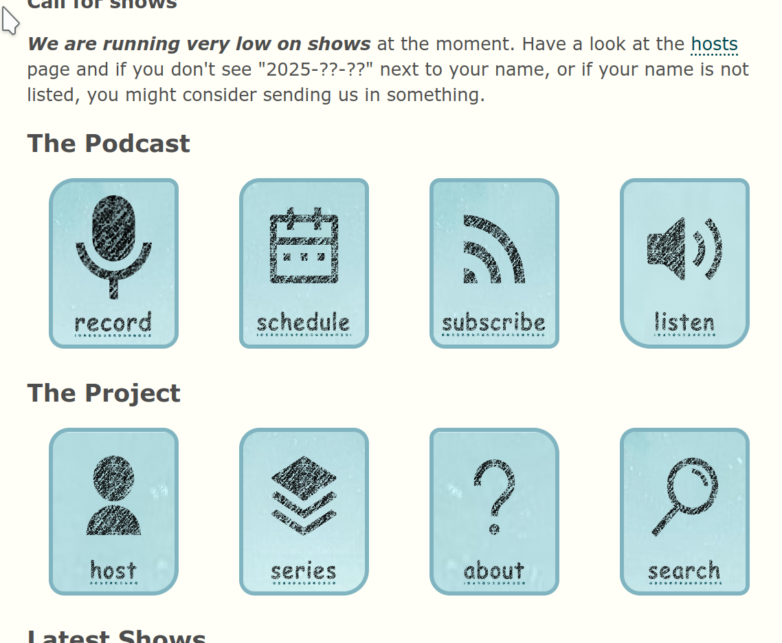 Hmm, something is up with the font rendering on the screenshot, it should be using a specific google font, it looks like it is using the fallback generic cursive font, better maybe to fallback to sans. The record icon is deliberately more pronounced - as Ken keeps saying, more than anything else the purpose of the website is to encourage people to record. But if that level of contrast works better. then the others, can be made similar. Again the backgrounds are deliberately trying to show some pixels and are mixed up a bit as to which part of the background image each one shows, both for variation and to try to give a rough work in progress feel. Maybe best just to standardise and reduce that complexity as it adds a lot of css with little payback.
