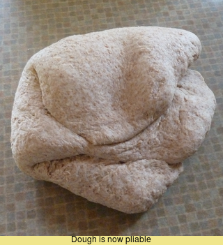 I find the ingredients (water+sugar, yeast, flour, salt and oil) mix together without problems in the food mixer and soon start to form a dough. I let the mixer work the dough for the recommended 3 minutes and get an end product that you can see in picture 6. I like to finish off the kneading by hand to make sure the dough is as elastic as it can be.