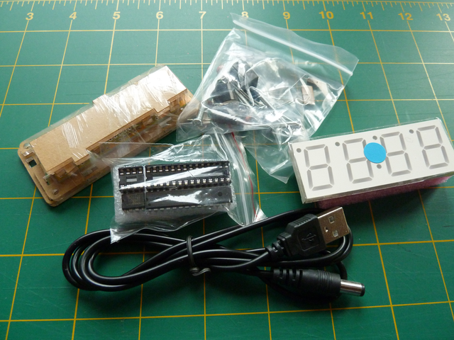 Contents were a PCB, a 4-digit display, a perspex box, two chips and associated sockets, various components and a USB power lead. Contrary to what is stated on the eBay site, there is a battery included in the kit, a CR1220 Lithium Cell.