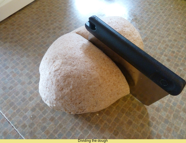 I divide the dough with the tool in picture 13 which is a dough scraper for use with the wet doughs produced by some recipes. I'm using some rather old bread tins described as 1lb loaf tins. Make sure to grease them well before placing the dough inside or it will be hard work to extract the loaves.